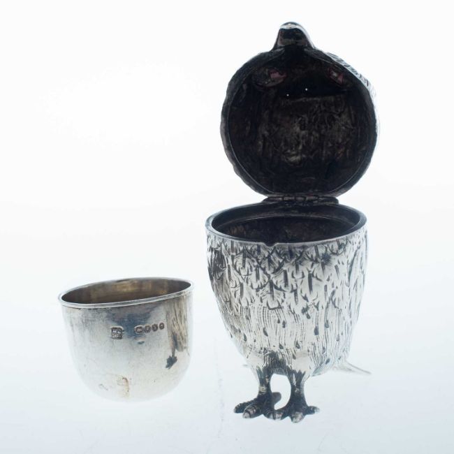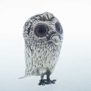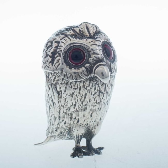 by George John Richards & Edward Charles Brown, London 1866, modelled in the form of an owl, with glass eyes, the hinged cover opening to reveal a removable liner by Jackson & Deere (William Henry Jackson & Peter Henderson Deere), London 1888. 8cm high, 2.7 troy ounces gross