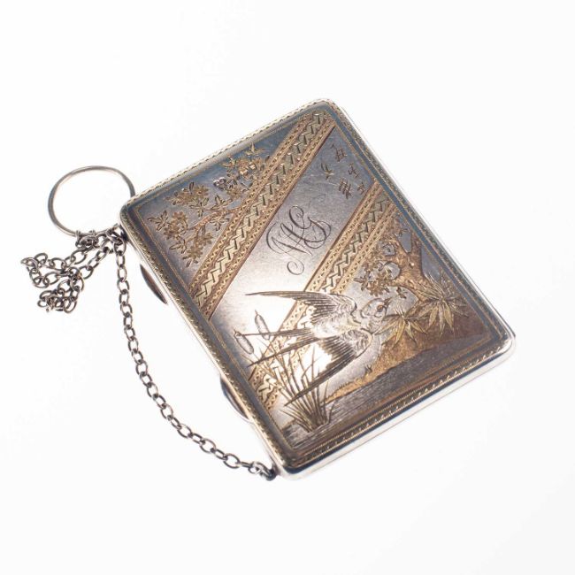 by Edward Charles Brown, London 1879, engraved with birds and prunus, initialled, incised with characters, with interior, suspended from a chain with a finger loop. 10cm by 7.6cm, 4.1 troy ounces gross