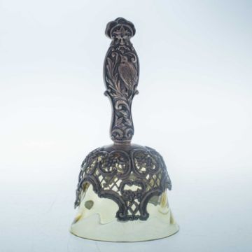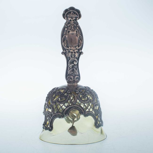 by William Comyns & Sons, London 1894, the yellow glass mounted with a silver handle, pierced and decorated with foliage, C-scrolls, flowerheads, Green Man masks and a bird. 13.3cm high