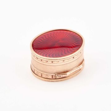 oval, the hinged cover and base decorated with red enamel. 33mm long, 19 grams gross
