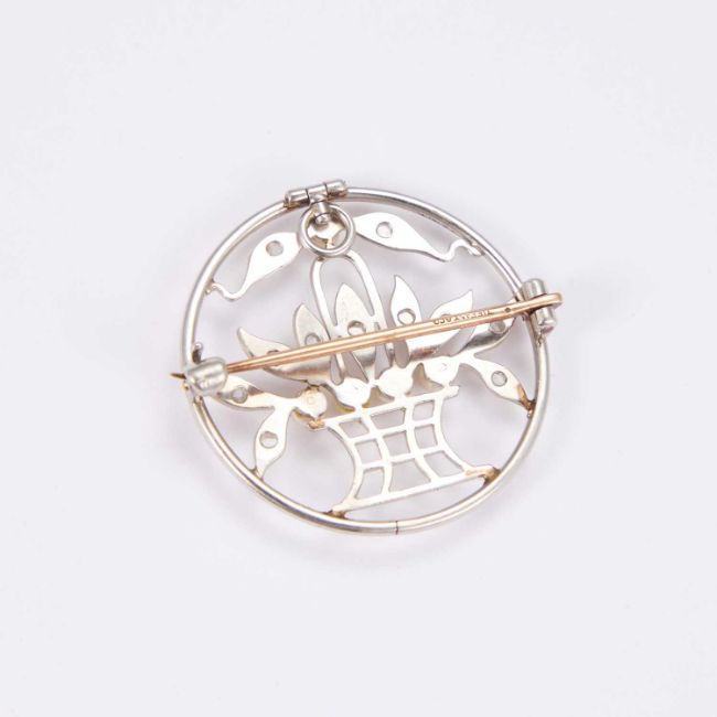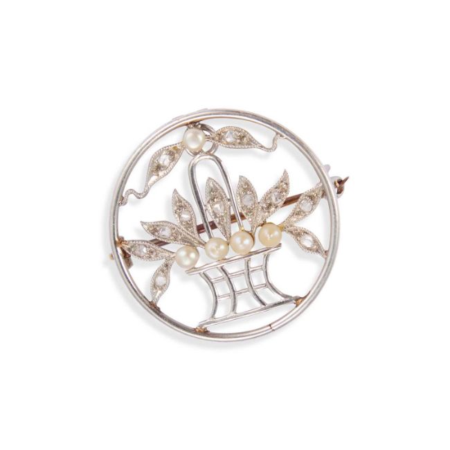 the circular open mount inset with intricate metalwork designed as a flower basket with leaf-shaped mounts set with diamond and seed pearl highlights, with a brooch pin fitting. 2.8cm diameter, 4.8 grams gross
