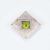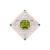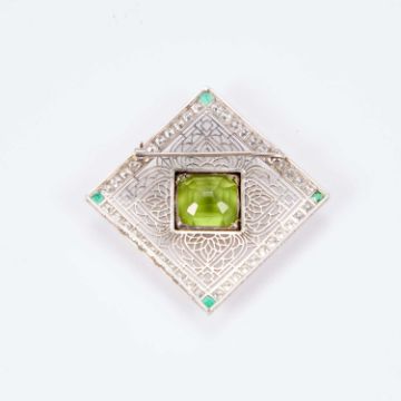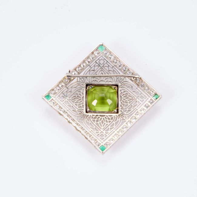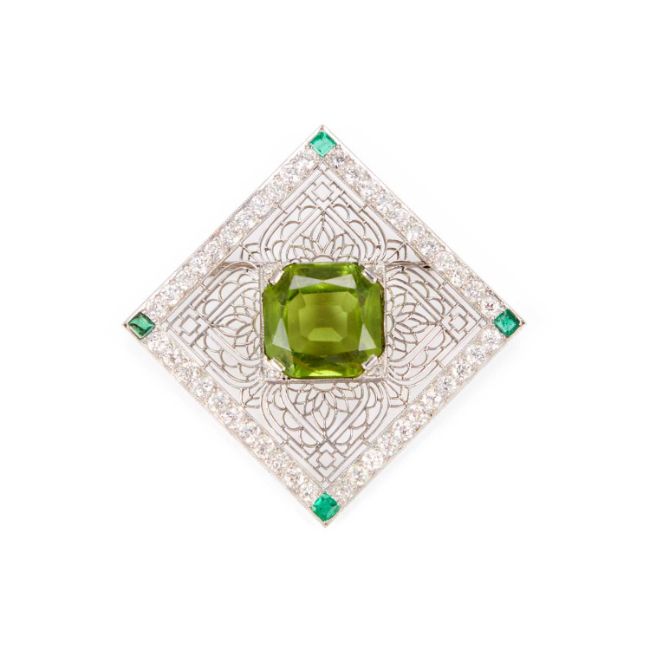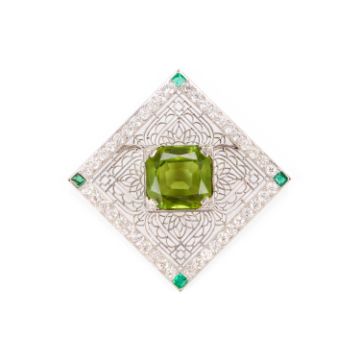 the square mount of delicate symmetrical pierced detailing inset to the centre with a large square-cut peridot, within a subtle border of brilliant-cut diamond highlights and four emerald highlights to each corner, on a brooch pin fitting. 3.5cm wide, 11.7 grams gross