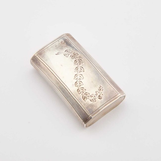 by John Law, Sheffield 1814, rectangular, shaped for the pocket, with engraved decoration. 6.7cm long, 1.4 troy ounces