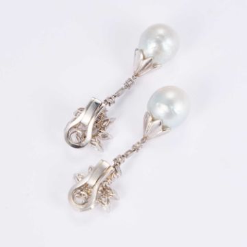 the large pearl drop suspended on an articulated link from an elaborate mount of pear-cut and rectangular-cut diamonds in a floral spray, on clip fittings. 5.5cm long, 20.5 grams gross