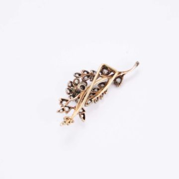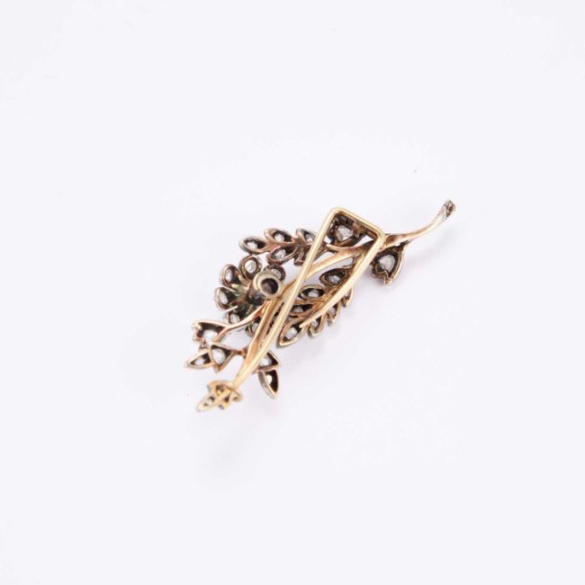 modelled as a floral spray, the principal flowerhead mount is set with an old brilliant-cut diamond with a spray of diamond highlight petals, amongst leaf-shaped mounts set throughout with diamond highlights, on a brooch pin fitting. 5cm long, 6.2 grams gross