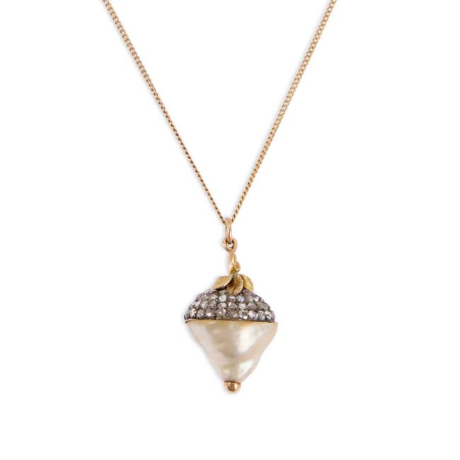the baroque pearl set beneath a diamond-set cap with a foliate pendant loop, on a fine link chain with a bolt ring clasp. Pendant 2.8cm long, 6.8 grams