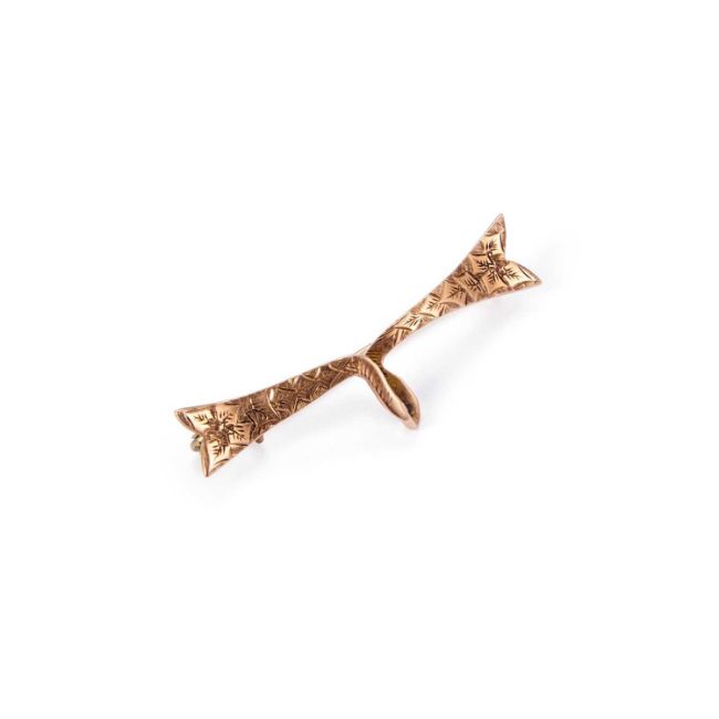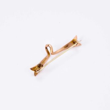 marked '375', designed as a curved ribbon with engraved detailing throughout, on a brooch pin fitting. 4cm long, 2 grams gross