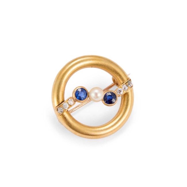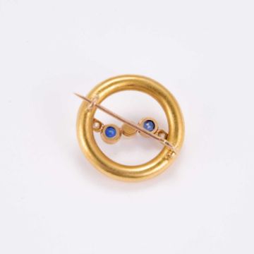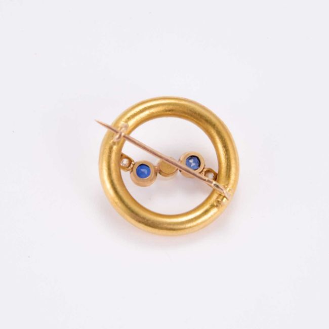 the circular mount inset to the open centre with a single cultured pearl between two round-cut sapphire highlights and two end terminal mounts each with three brilliant-cut diamond highlights, on a brooch pin fitting. 2.5cm diameter, 6.3 grams gross