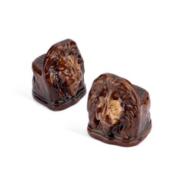 modelled naturalistically as lion heads, under a dark ochre treacle glaze. (2) 13cm