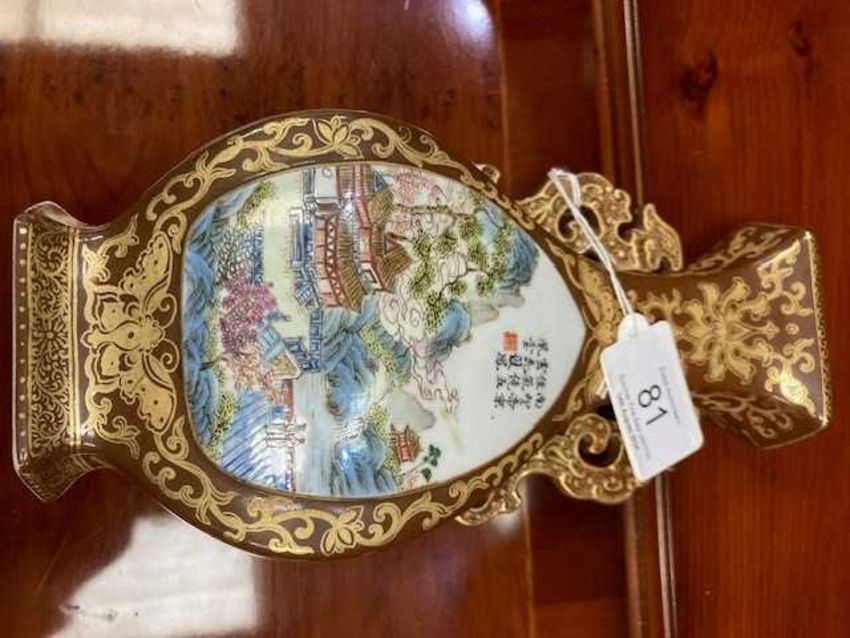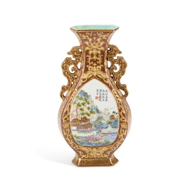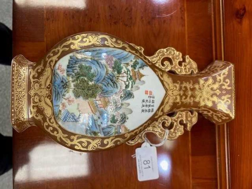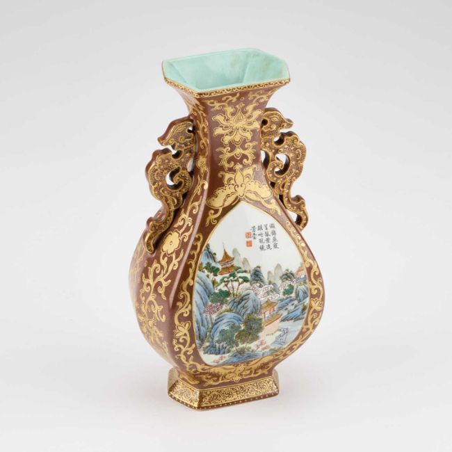 decorated with two landscape reserves, the ground richly gilded, bears an iron-red mark. 21cm high