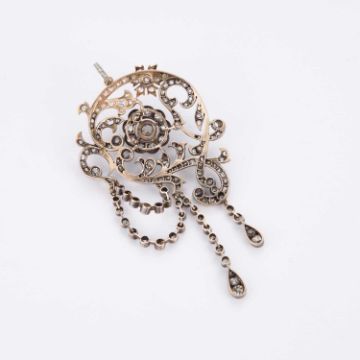 the elaborate floral mount of scrolling foliage with a central flower head mount set throughout with old brilliant-cut diamonds, suspending two articulated diamond-set swags and drops, with a diamond-set pendant loop. Estimated total diamond weight 8.40cts, 8.5cm long, 19 grams gross