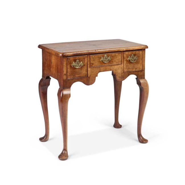 with three drawers, raised on cabriole legs. 73cm high, 73cm wide, 43cm deep