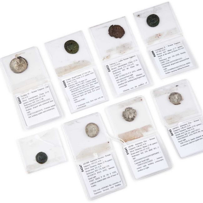 including two Antonius Pius (138-161 A.D.), silver; Gordian III (238-244 A.D.), silver; Septimius Severus (193-211 A.D), silver; Constantius II (337-361 A.D), bronze; Tetricus I, Gallic Roman Emperor (271-274 A.D), bronze; Crispus (317-326 A.D.), bronze; etc. (8)