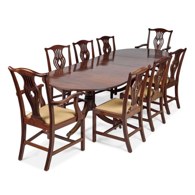 the top with D-shaped ends and a reeded edge; together with a set of eight Georgian style mahogany dining chairs, including a pair of carvers. (9) Table 72.5cm high, 274.5cm long, 109cm wide