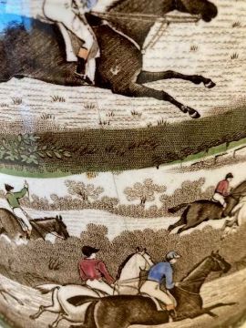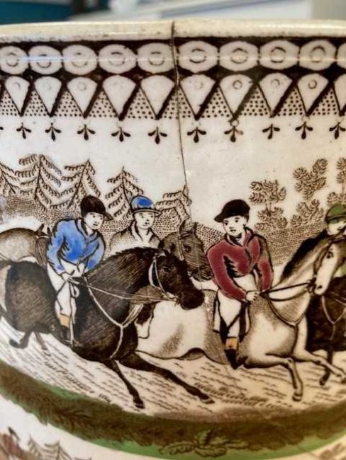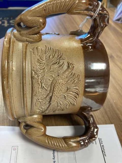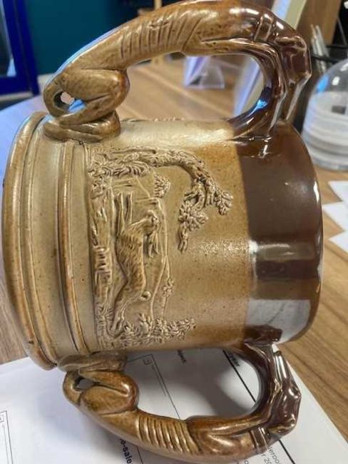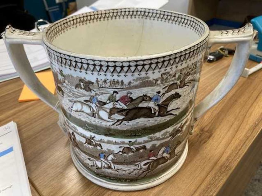 The large steeplechase loving cup has been amateurly restored and has hair line cracks, the Salt glazed tyg is in good condition commensurate with age and the same with the Ironstone jug, additional photographs attached