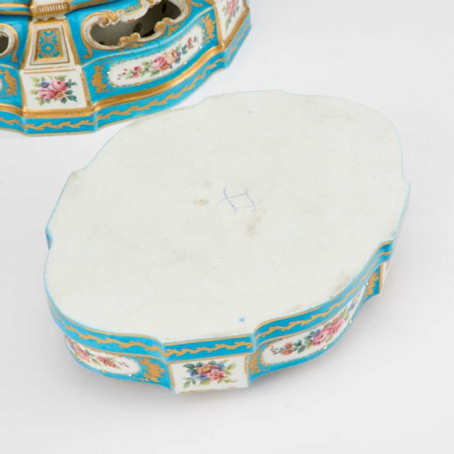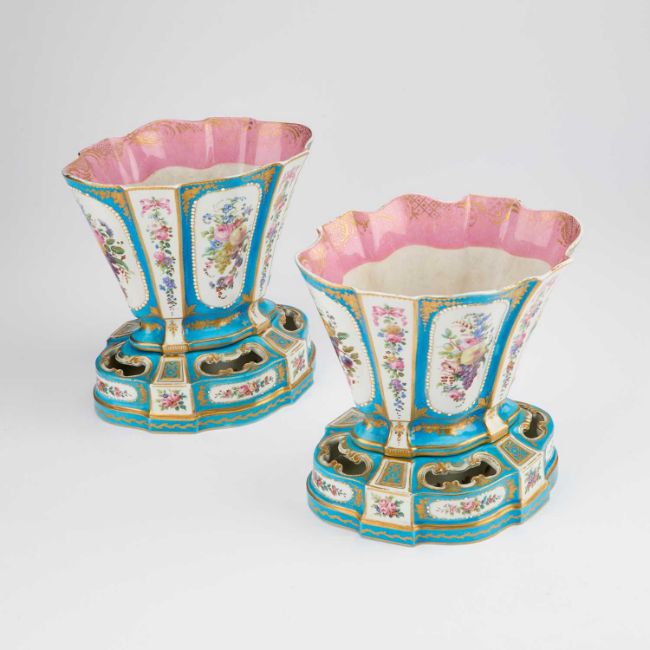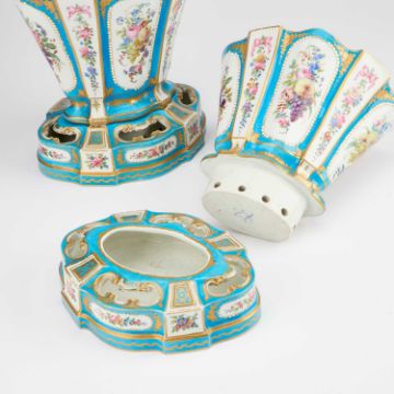 the top sections are reserved with panels depicting figures and flower sprays, the pierced bases are reserved with cartouches of flower sprays, interlaced Ls on the underside of the bases. (4) 19.5cm high