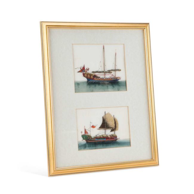 each depicting a boat, on rice paper, framed as one. Each 15cm by 21cm