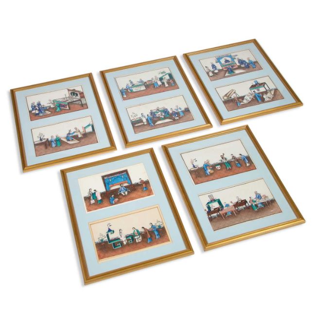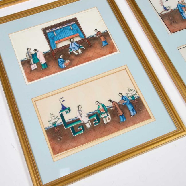 variously depicting interior scenes of ceremonial and courtly instruction of young adherents, others relating to maternal instruction, within black line borders. (10) 19cm by 31cm