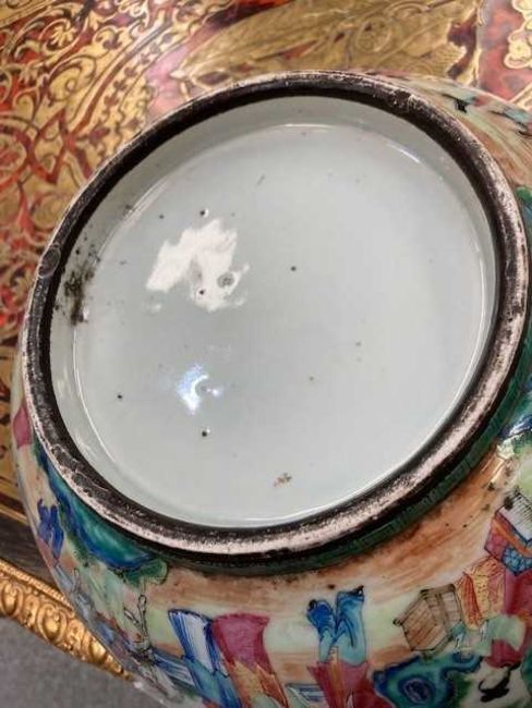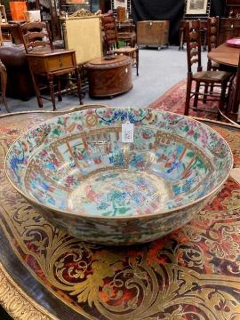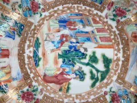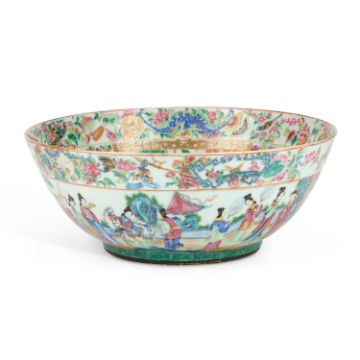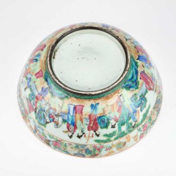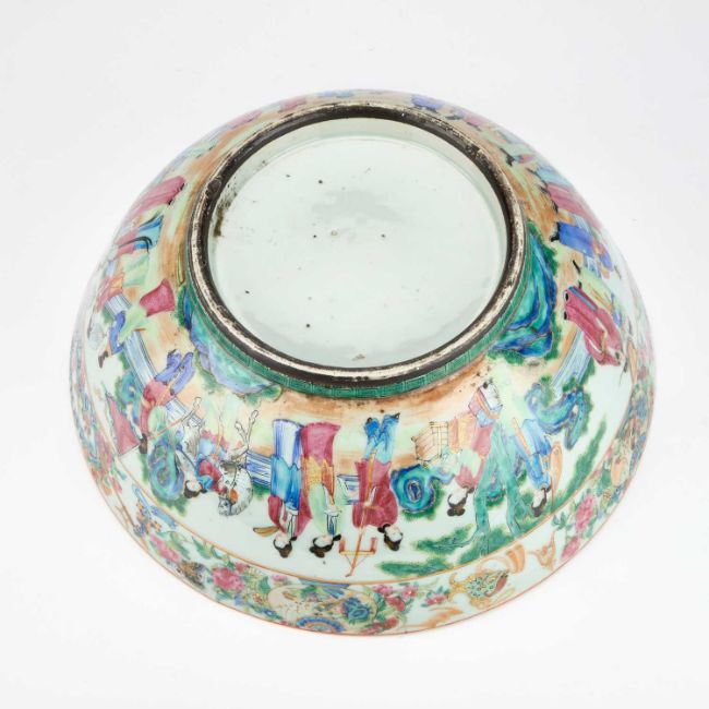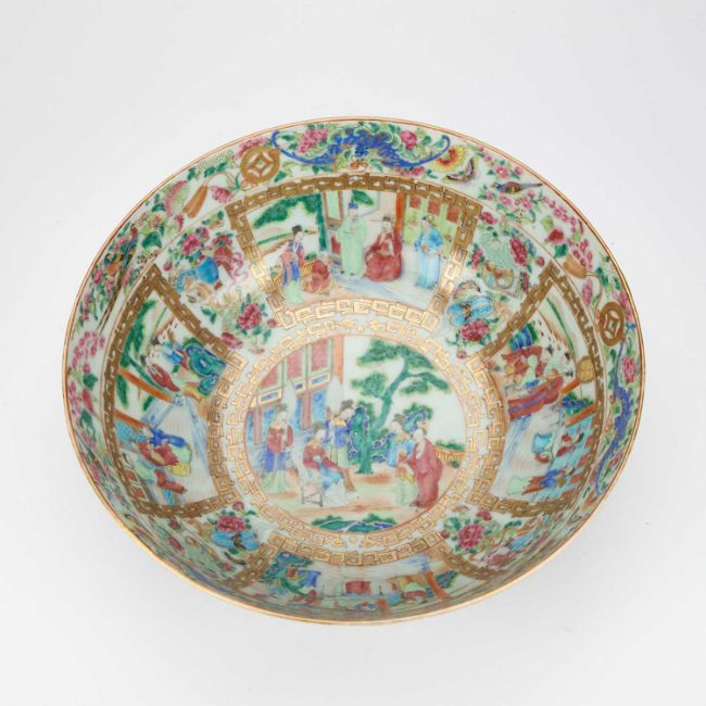 painted and gilt with elaborate scenes of courtly figures at various pursuits, the interior with a central roundel below a continuous frieze, the exterior with a continuous scene, below precious objects and borders of insects, bats, flowers, and lanterns. 33.5cm diameter