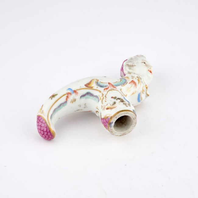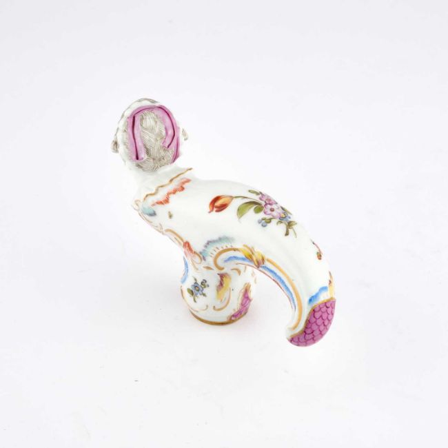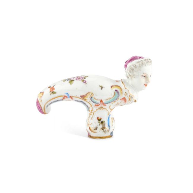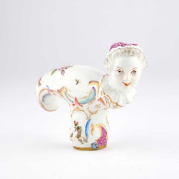 modelled as a female head wearing a bonnet and ruff, moulded with scrollwork and painted with flowers and sprigs. 13cm long