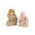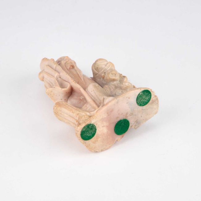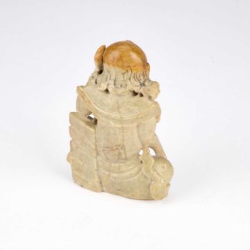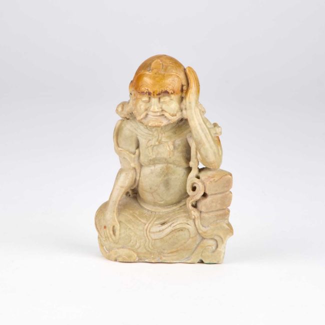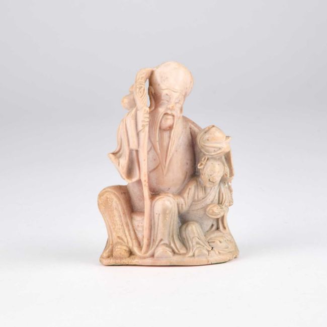 one of green hue depicting meditating Lohan leaning on a rock; the other of roseate hue depicting Shoulao and consort, both seated, holding peaches, the bearded sage wielding a peach staff with gourd finial. (2) First 13.5cm, second 12cm