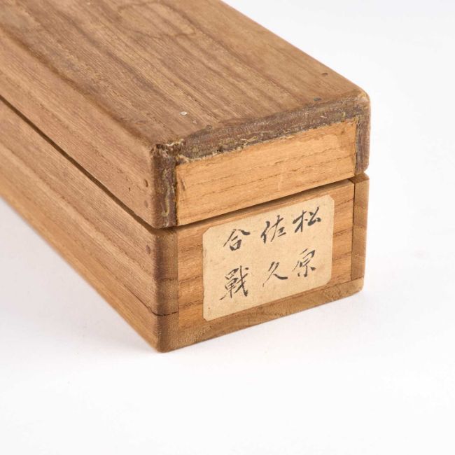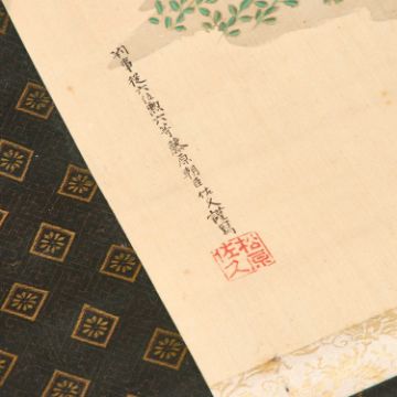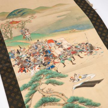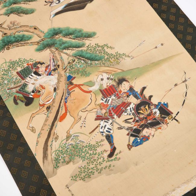 in ink and colour on silk, depicting a scene from the Battle of Kikuchi, one of the serial wars to subdue the Kamakura Shogunate led by the Godaigo Emperor, or the Kikuchi and Aso clans, from the imperial loyalist attacking the Hojyo Hidetoki from the Kamakura Shogunate in Kyushu, signed Hanji jyo rokui dou rokuto Fujiwara Ason saka kinsha with seal Matsubara Saku, with tomobako inscribed and titled by his pupil, Masayoshi. 49.5cm by 135cm