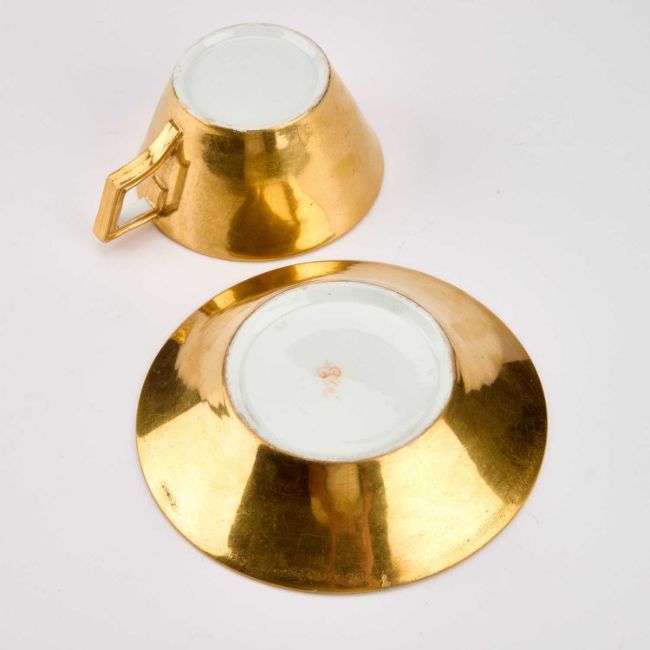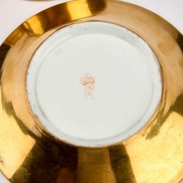 There is a hairline crack in the saucer. Each with some age-related wear to the gilding.