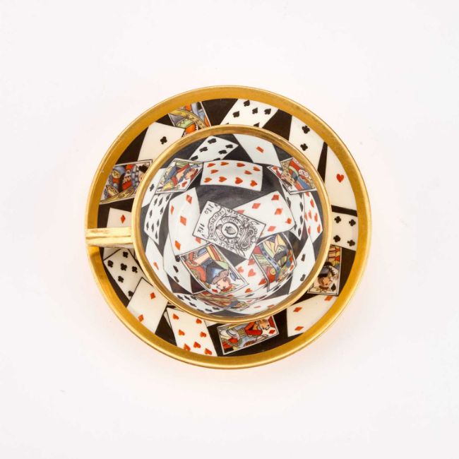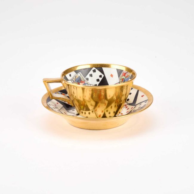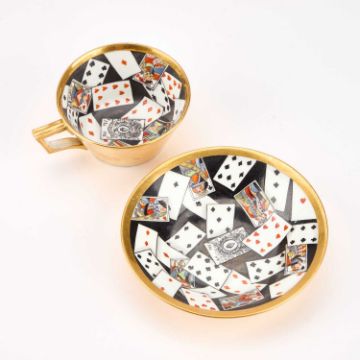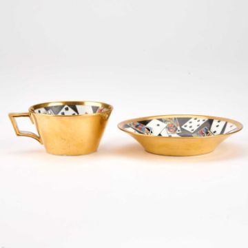 each boldly painted with a deck of cards on a black enamel ground, the centre with a duty card, the exteriors gilded, crown, crossed batons and D mark in red. (2) Saucer 13.5cm diameter