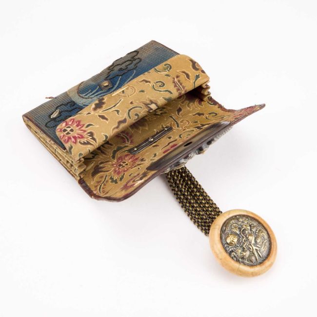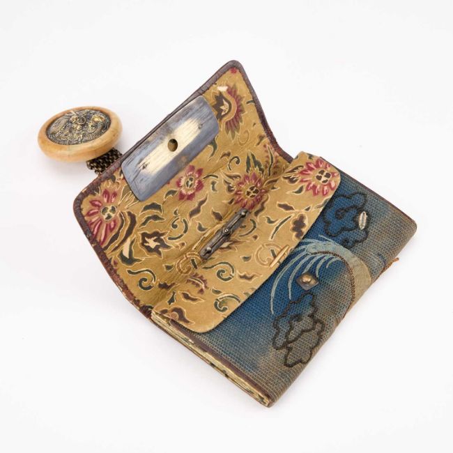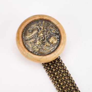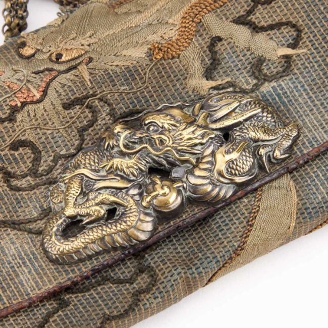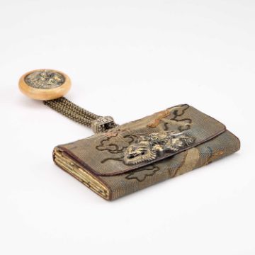 worked with a dragon, the brass mae-kanagu (clasp) a writhing three-clawed dragon, with a kagamibuta netsuke attached by linked chains, the netsuke with thinly veneered wooden bowl bearing a silvered metal plate with a three-clawed dragon in relief, writhing amongst clouds as it grasps a tama (sacred jewel) in one claw. Pouch 14cm long
