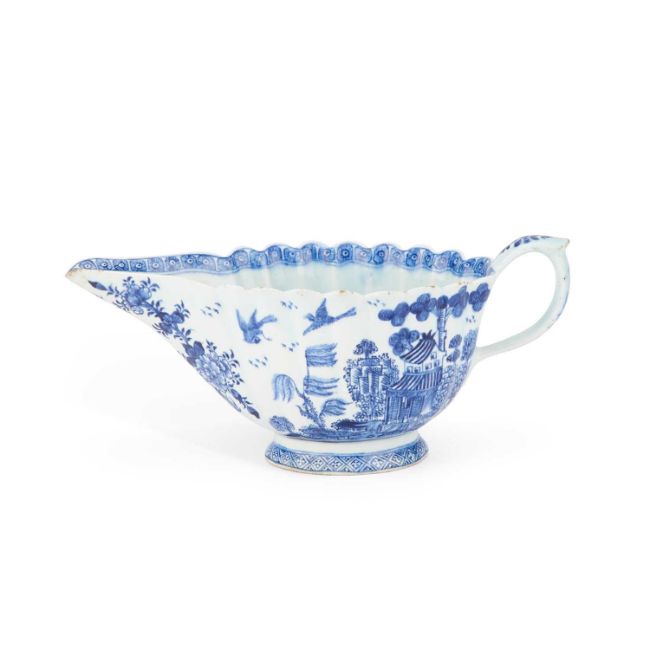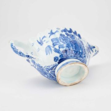 silver-shaped, painted in blue with a 'Desirable Residence' type pattern. 23cm long