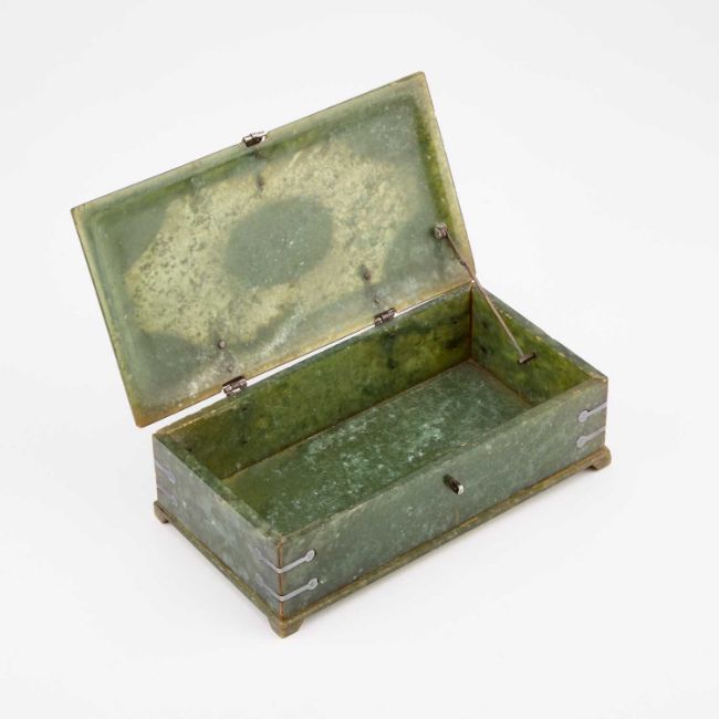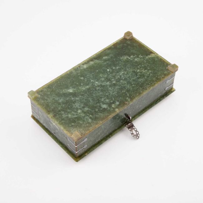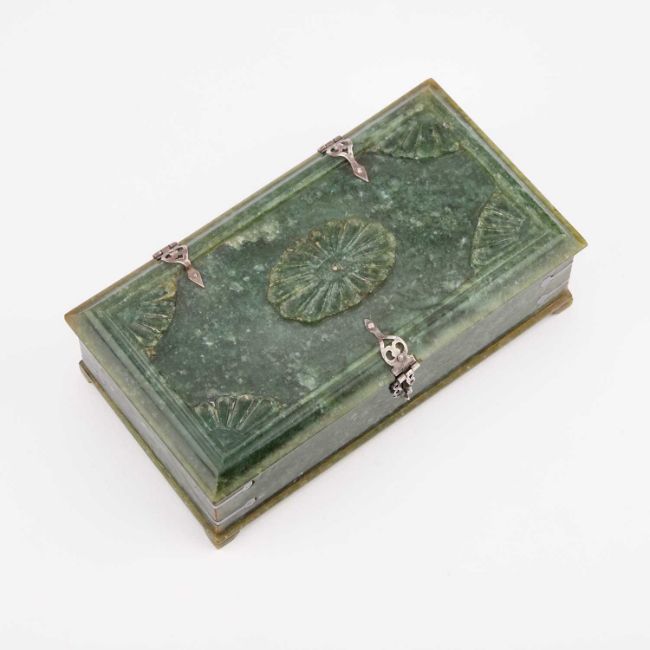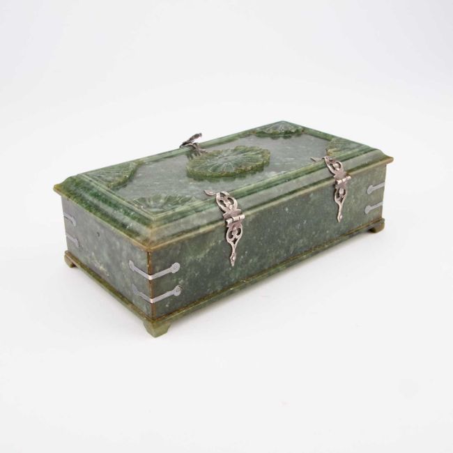 rectangular, the carved cover with silver mounts. 15.5cm long