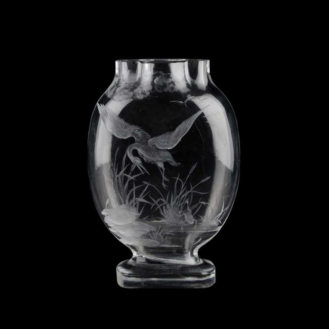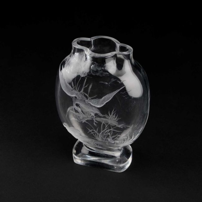 an intaglio carved to each side with a crane in flight pursuing a leaping toad in an aquatic landscape, apparently unsigned. 23.5cm high