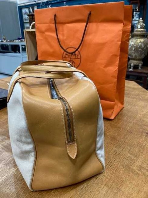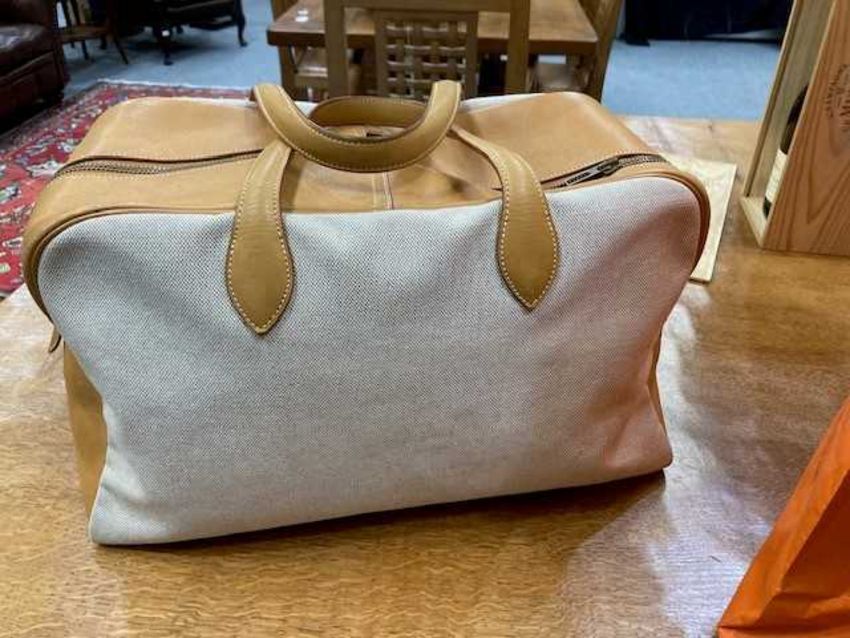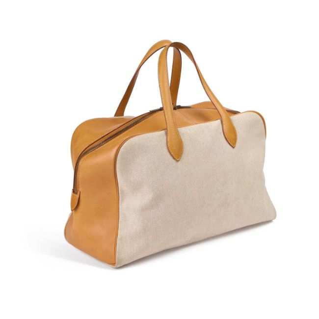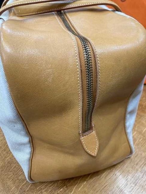 canvas with leather trim and handles, yellow metal hardware. 43cm wide