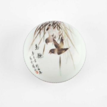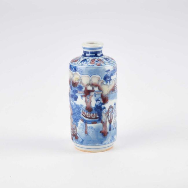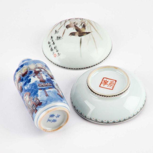 cylindrical, painted with figures, bears a four-character mark in underglaze blue; together with a Chinese circular box and cover. (2) Snuff bottle 9cm high