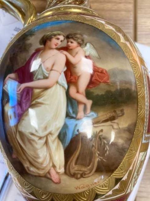 late 19th Century, of baluster form with a tall scroll handle, painted front and back with oval mythological views, named in German on the underside, the ground elaborately panelled and enriched in gilt in the Neoclassical taste, on a conforming stand, underglaze blue beehive mark. 42cm high