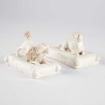 modelled as a King Charles Spaniel and a Poodle, each on a tasselled cushion, unmarked. (2) 10.5cm long
