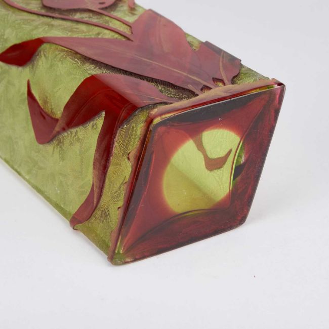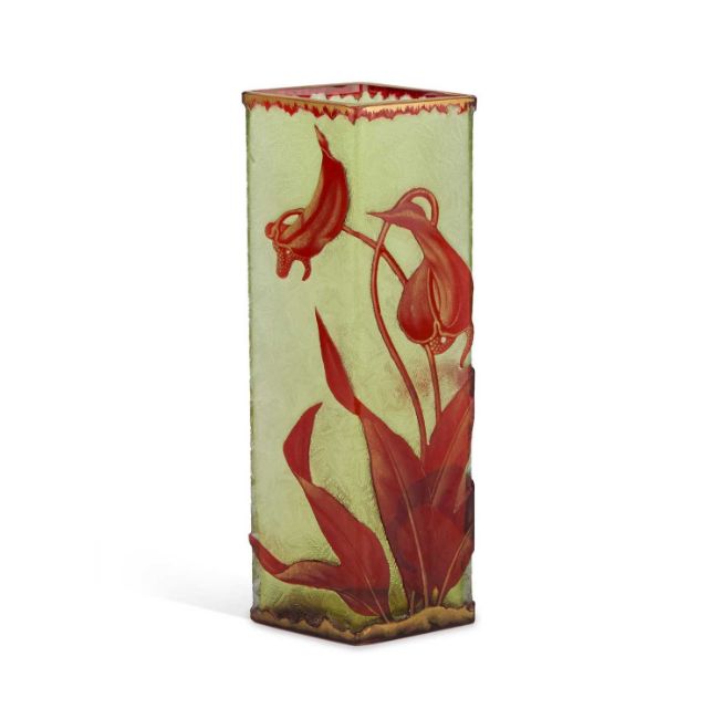 of lozenge-section, moss-coloured tint encased in ruby and cut in relief with large irises highlighted in gilding. 25.5cm high