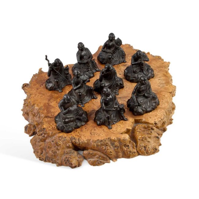 on a burrwood stand, each with character marks. (10) Tallest 8.5cm