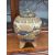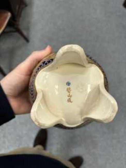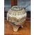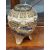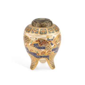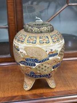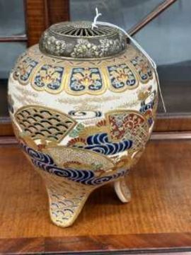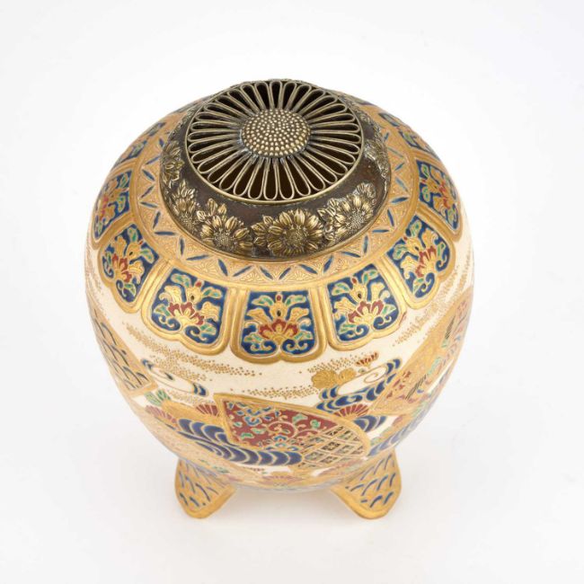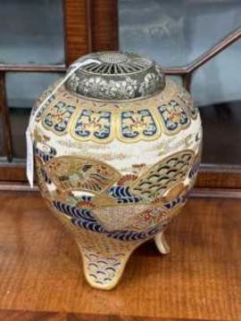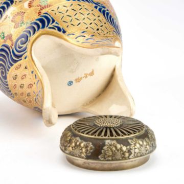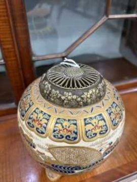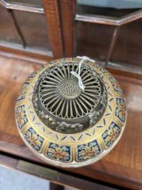 signed, painted and gilded with fans, waves and flowers, with a silver coloured metal cover. 19cm high