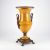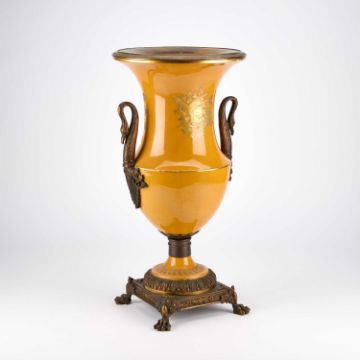 richly gilded, painted with a cavalry scene, signed Luce, within a leaf-framed panel, applied swan-form handles, the square base with paw feet, red painted mark. 61cm high