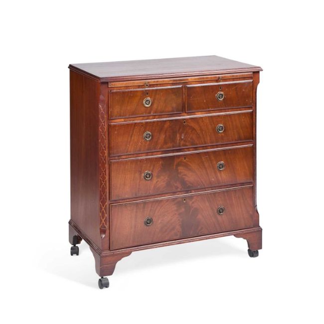 with a dressing slide above two short over three long graduated drawers, fitted with brass handles, flanked by blind fretwork canted corners, raised on bracket feet and later fitted with castors. 93.5cm high, 82cm wide, 49cm deep