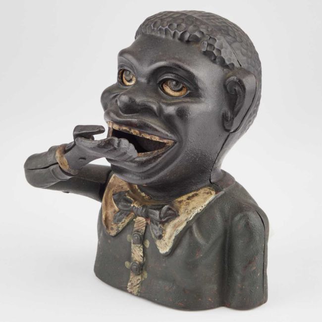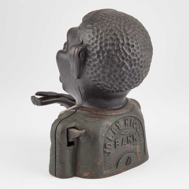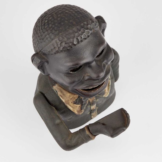 A VINTAGE CAST IRON 'JOLLY' MECHANICAL NOVELTY MONEY BANK 16cm highFunctions correctly. Surface wear. Notice from the the-saleroom.com: These items are listed on the basis they are illustrative of a bygone culture in which there were different social norms. We understand the potential controversy surrounding this type of item but believe that providing transparent information about historical context fosters greater understanding of our complex cultural history.