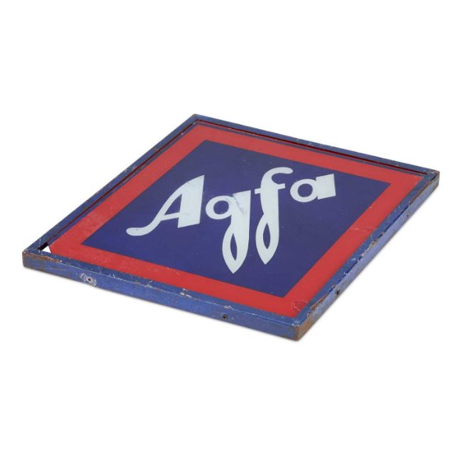 The left corner of glass is missing, some scratches and wear to the painted glass and metal frame.