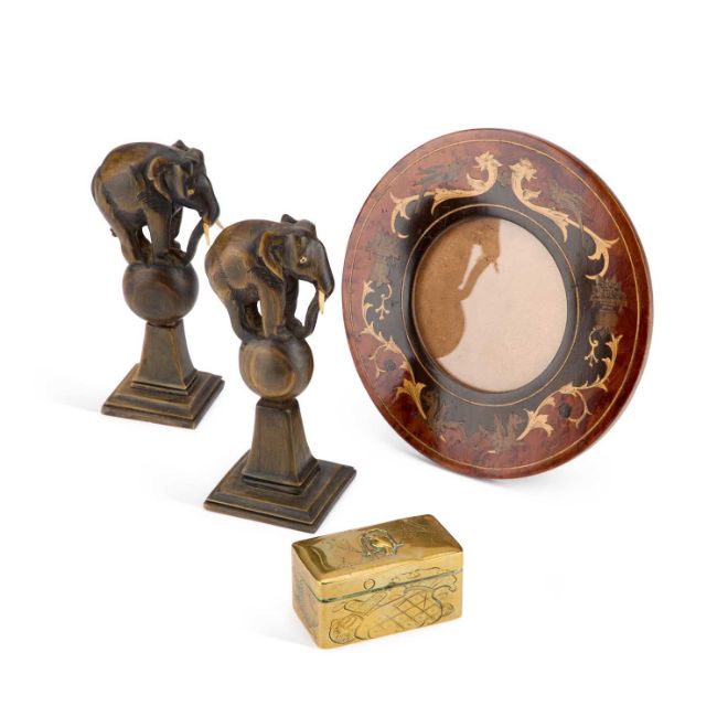 together with an inlaid circular photograph frame and a pair of carved elephants with faux ivory tusks. (4) Frame 16.5cm diameter