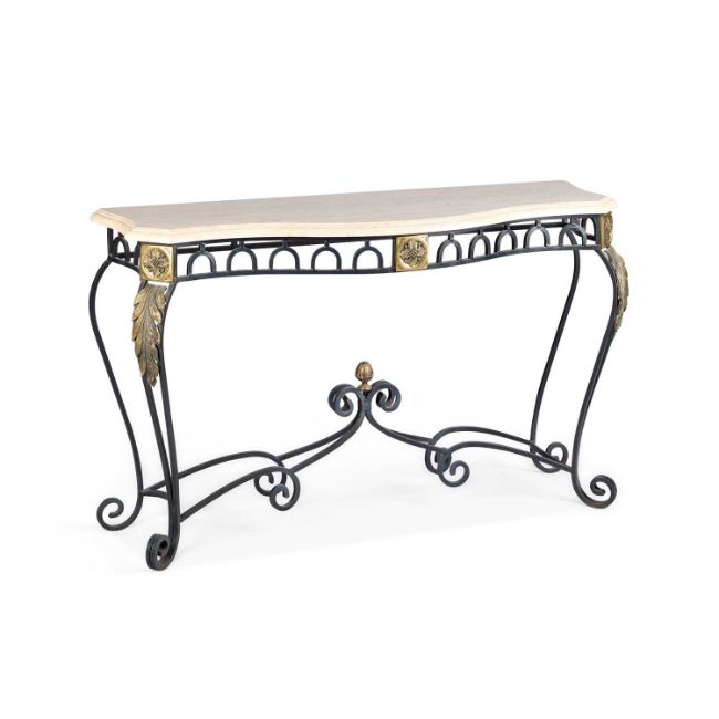 the top with a serpentine front, raised on scroll-form legs applied with leaves. 78cm high, 130cm wide, 43cm deep