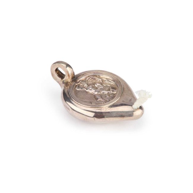 by Stewart Dawson & Co Ltd, London 1909, in the form of a Roman lamp, chased with a figure. 9.2cm long, 1.4 troy ounces