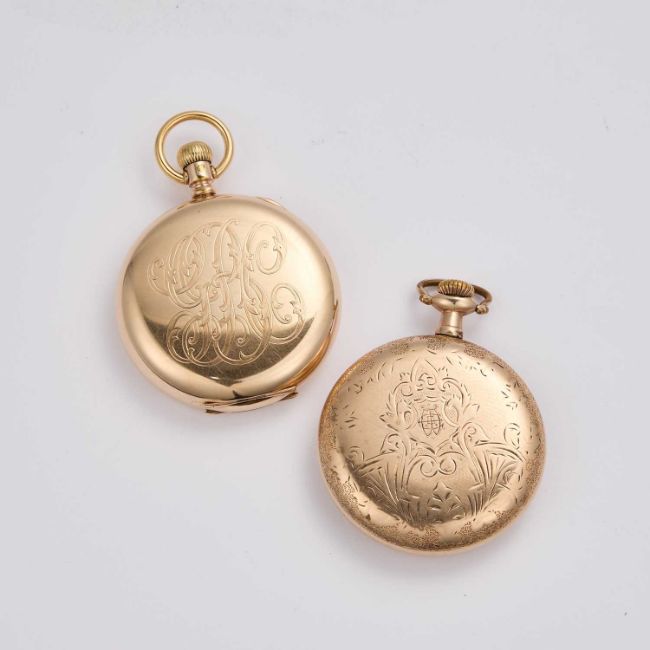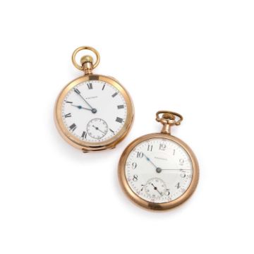 comprising the first with a circular white enamel dial signed Waltham with black Roman indices and outer minute track, sub seconds dial at the 6 o'clock position, blued steel hands, hinged double covers to the rear with outer monogram, keyless movement signed AWW Co Waltham Mass 17 Jewels, serial no. 13968010; the other with a circular white enamel dial signed Waltham with Roman indices and outer minute track with additional red 5 minute markers, sub seconds dial at the 6 o'clock position, blued steel hands, scroll decorated case with a screw-on back, manually wound movement signed AWW Co Waltham Mass, serial no. 19118854. (2) Diameter of each case 50mm