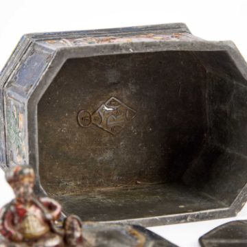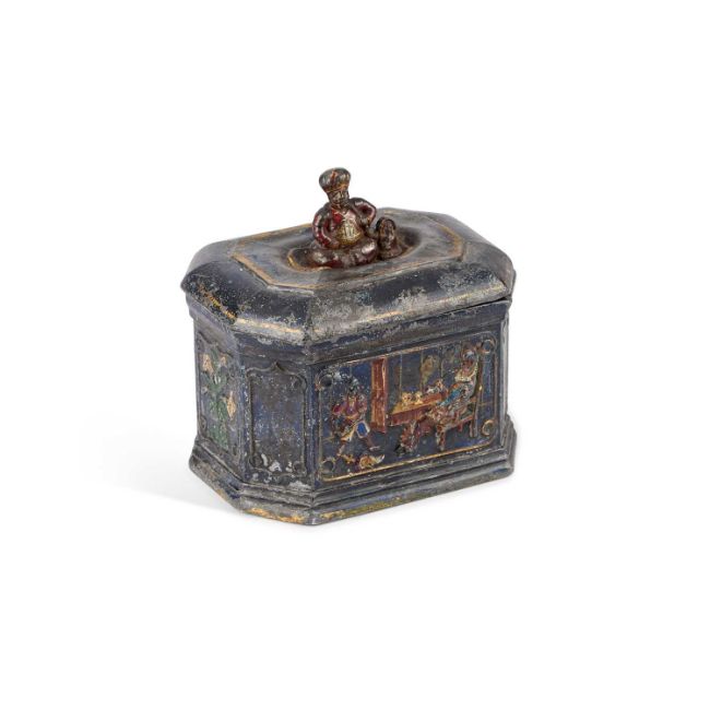 rectangular form with canted corners, the pull-off cover with a finial modelled as a Turk smoking a hookah, the sides decorated with panels of flowers, with a panel to either long side of an interior with a seated smoking gentleman and a slave, all painted with polychrome enamels, the original tamper to the inside along with a registered design mark to the base. 13cm high