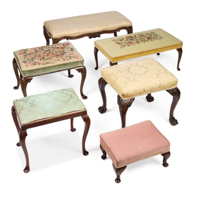 on leaf-carved cabriole legs with ball and claw feet; together with four further stools. (5)