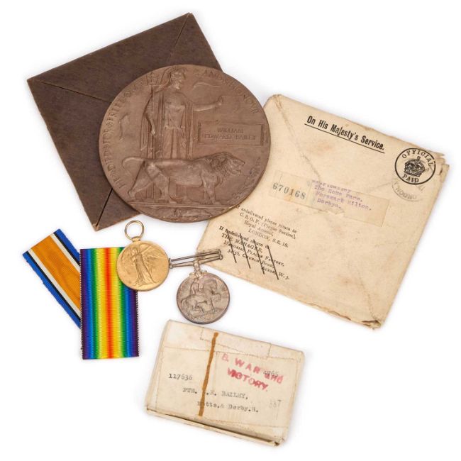 comprising a War Medal, Victory Medal and Death Plaque, awarded to 117636 Pte. W. E. Bailey, Notts & Derby. R, with box, card holder and postal envelope. (Qty)
